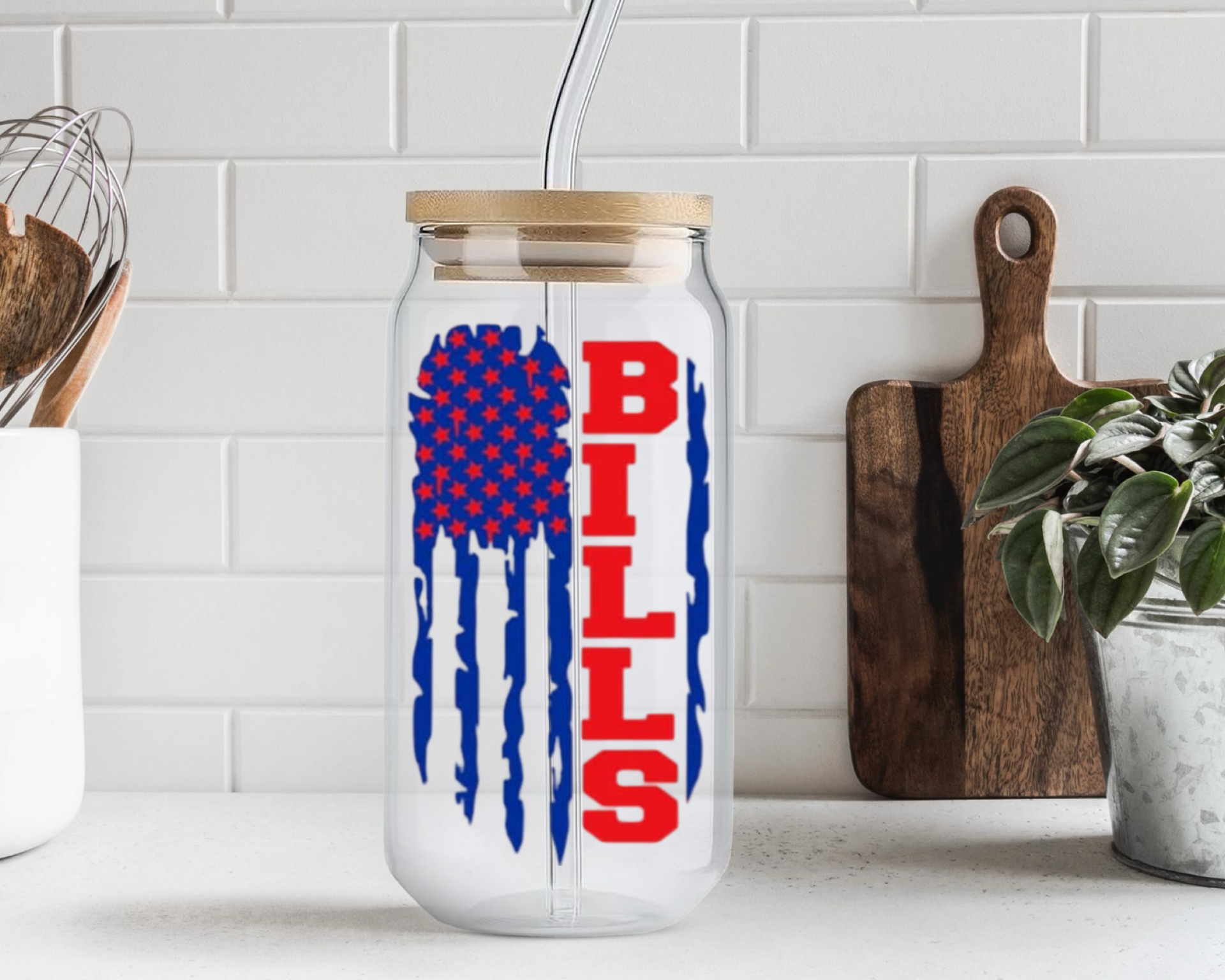 Introducing Buffalo Bills Tumbler! These glass cups come with a durable bamboo lid and reusable glass straw, making them a sustainable and eco-friendly alternative to disposable cups. Enjoy your favorite beverages while reducing waste and supporting your favorite team.